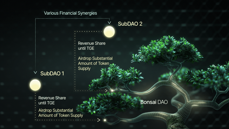 Bonsai DAO is a groundbreaking initiative in the DeFi sector, establishing a metaDAO ecosystem characterized by its scalability, flexibility, and adaptability. The inception of Bonsai DAO marks a strategic evolution designed to enhance stakeholder engagement and foster growth. Unlike traditional DAO structures, Bonsai DAO leverages the dynamism of SubDAOs to provide diverse financial products and services, thereby offering a broader, more inclusive approach to asset management and growth strategies. A key component of this approach includes strategic Airdrops from subDAOs to $Bonsai holders, incentivizing participation and investment within the ecosystem. Additionally, the interconnectivity of the subDAOs within the ecosystem boosts the value of each subDAO and the metaDAO as a whole, further enriched by these airdrops which serve as tangible rewards for stakeholders' loyalty and support.