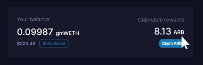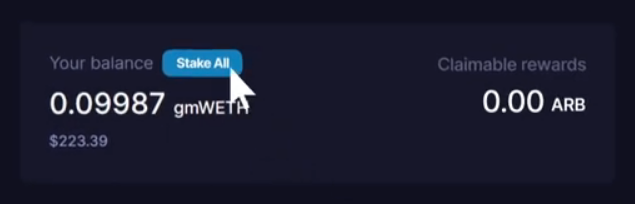 If there are $ARB or any other emissions availabile, Stake All button will appear above your balance and you'll have to stake your deposit to earn those.&#x20;
